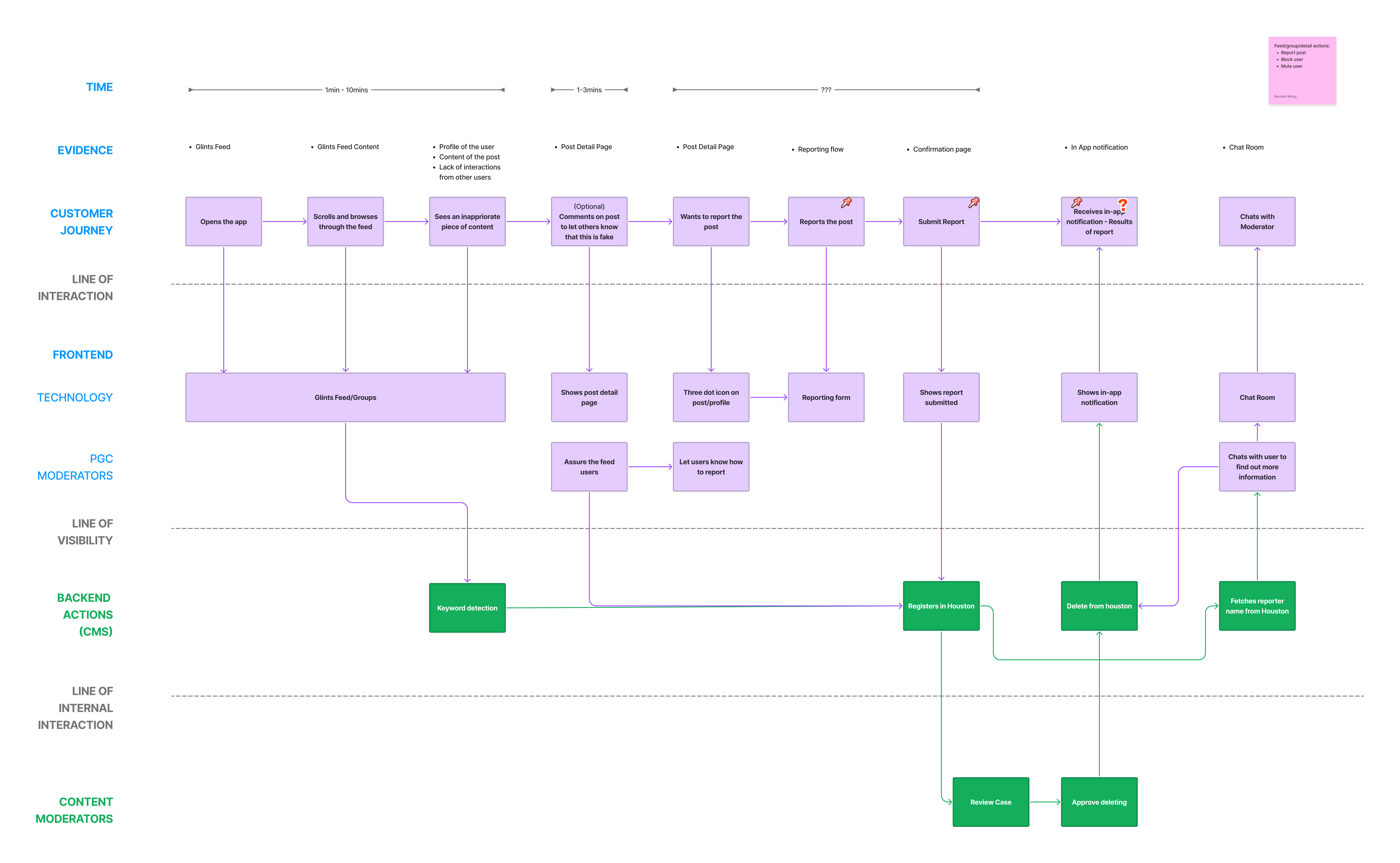With a clear understanding of available strategies, I created a service blueprint to map anti-spam measures across the user journey and platform touchpoints. This ensured seamless integration without compromising user experience.