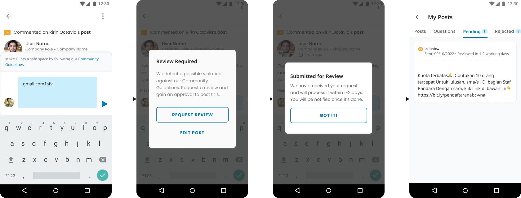 Posts or messages containing blacklisted keywords are automatically flagged and sent for review by the content operations team,