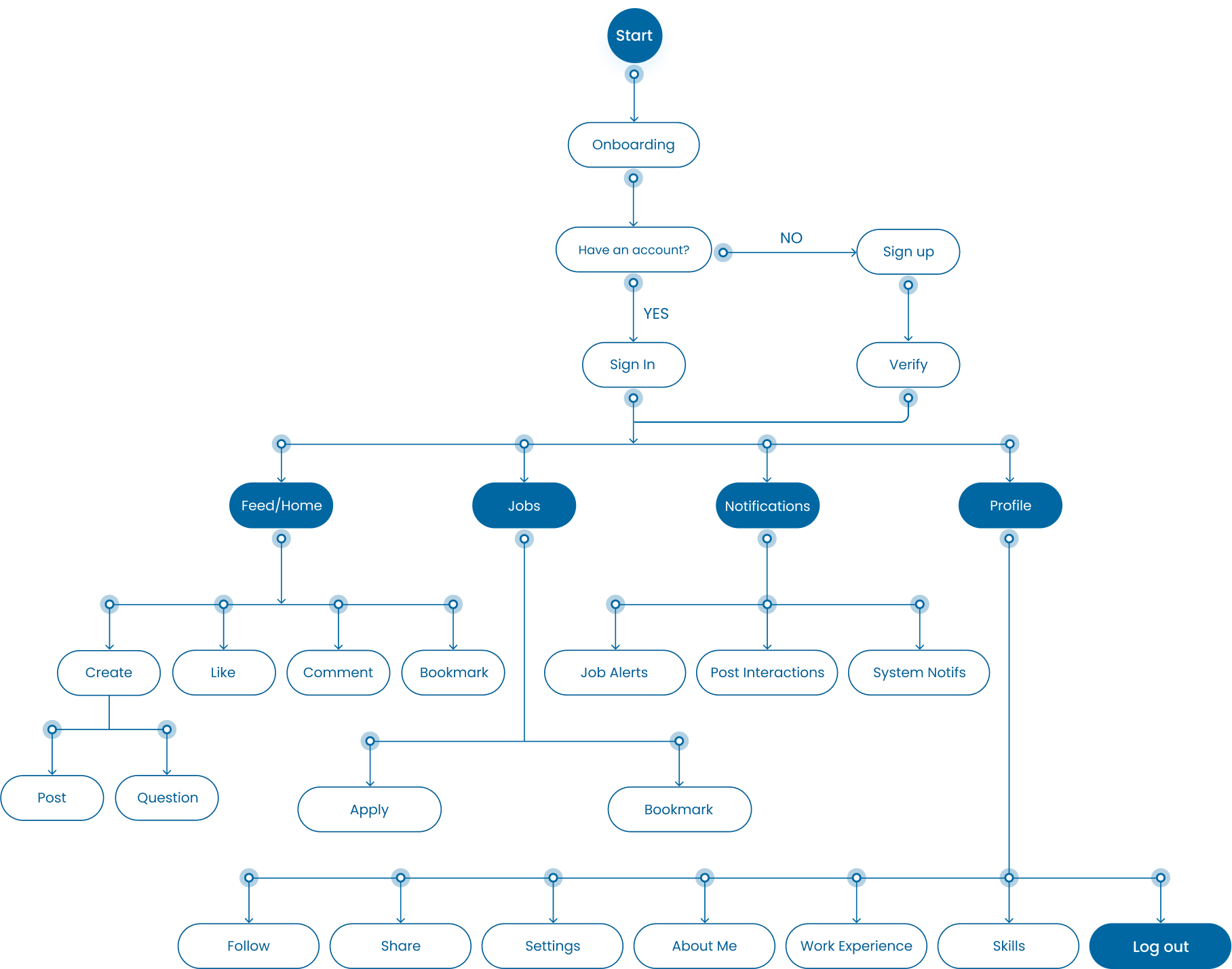 The sitemap of the first version of the mobile app, organizing MVP features like Sign In/Sign Up, Social Feed, and Job Applications for seamless navigation. This early planning ensured clarity, reduced ambiguity, and laid a strong foundation for design and development.