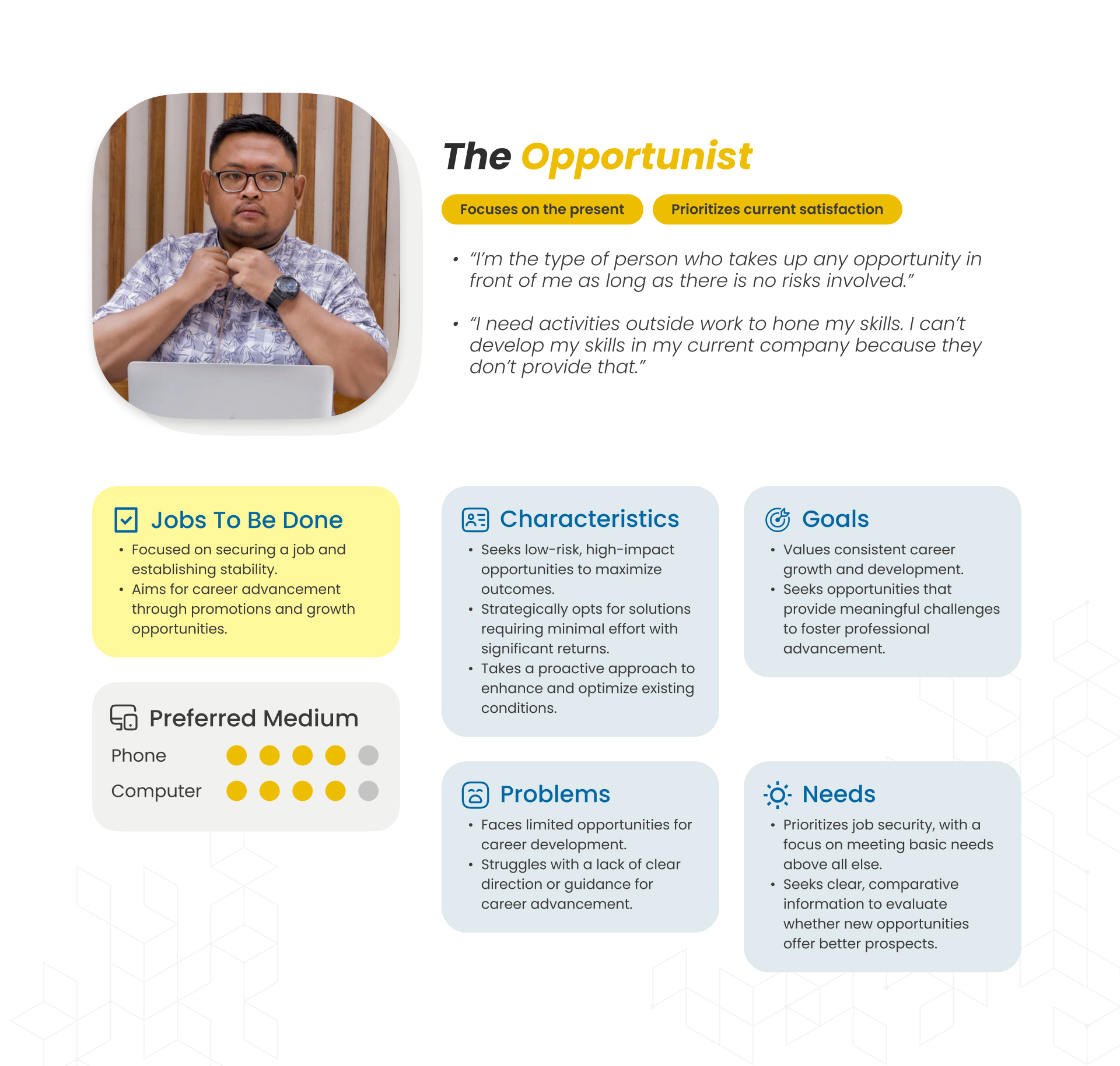 This persona is motivated by long-term career stability and growth. Their decisions are driven by opportunities that enhance job security, skill development, and clear paths to advancement.