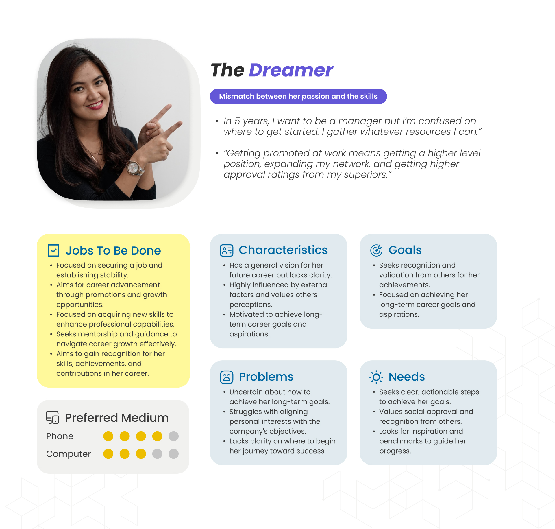 Highly motivated by career security, skill growth, and upward mobility. She values mentorship, seeks recognition for her achievements, and strives for professional credibility.
