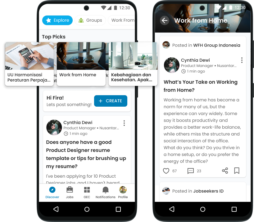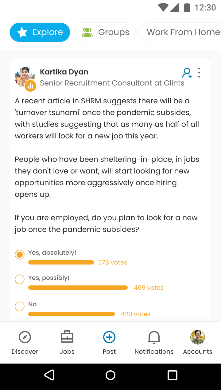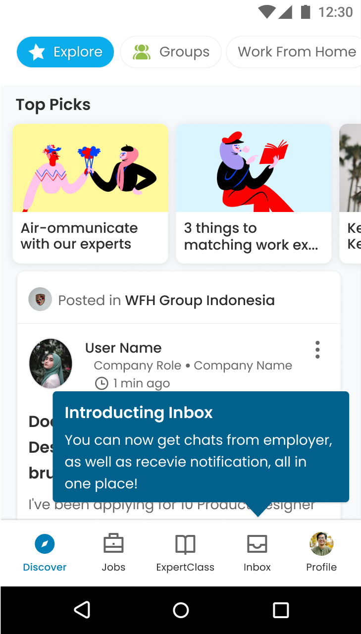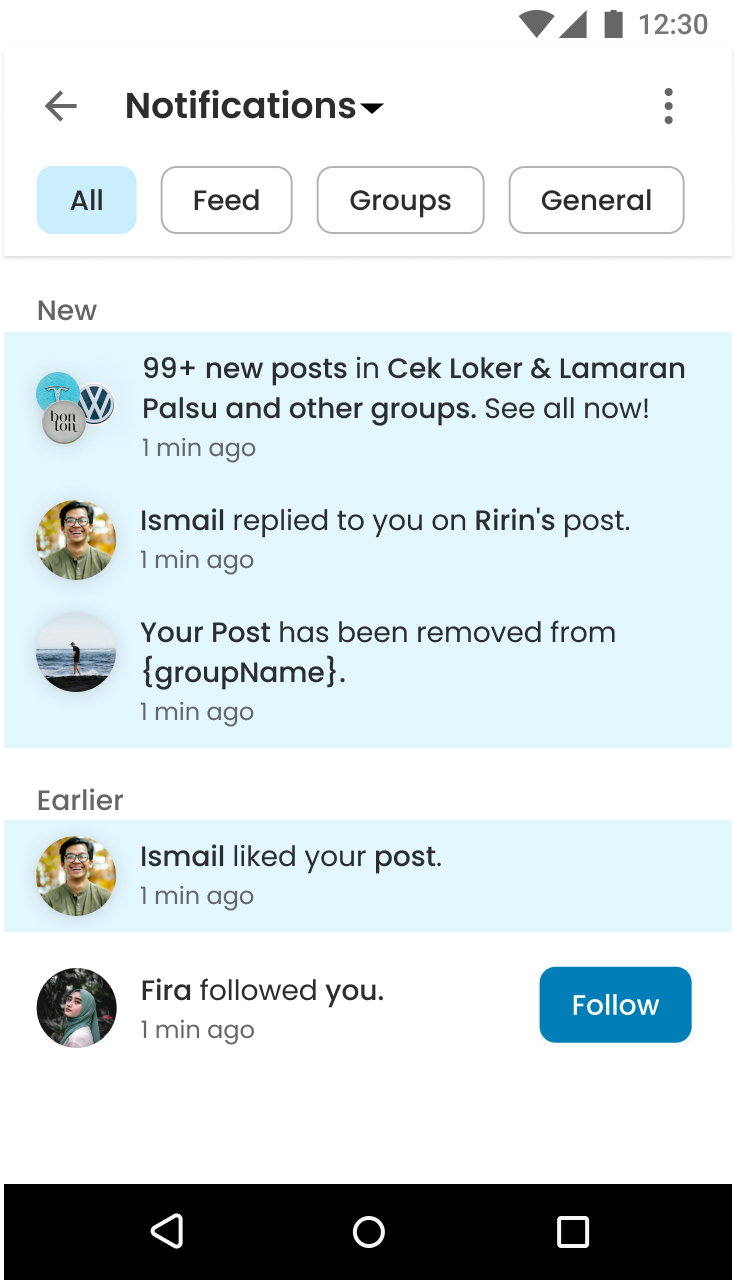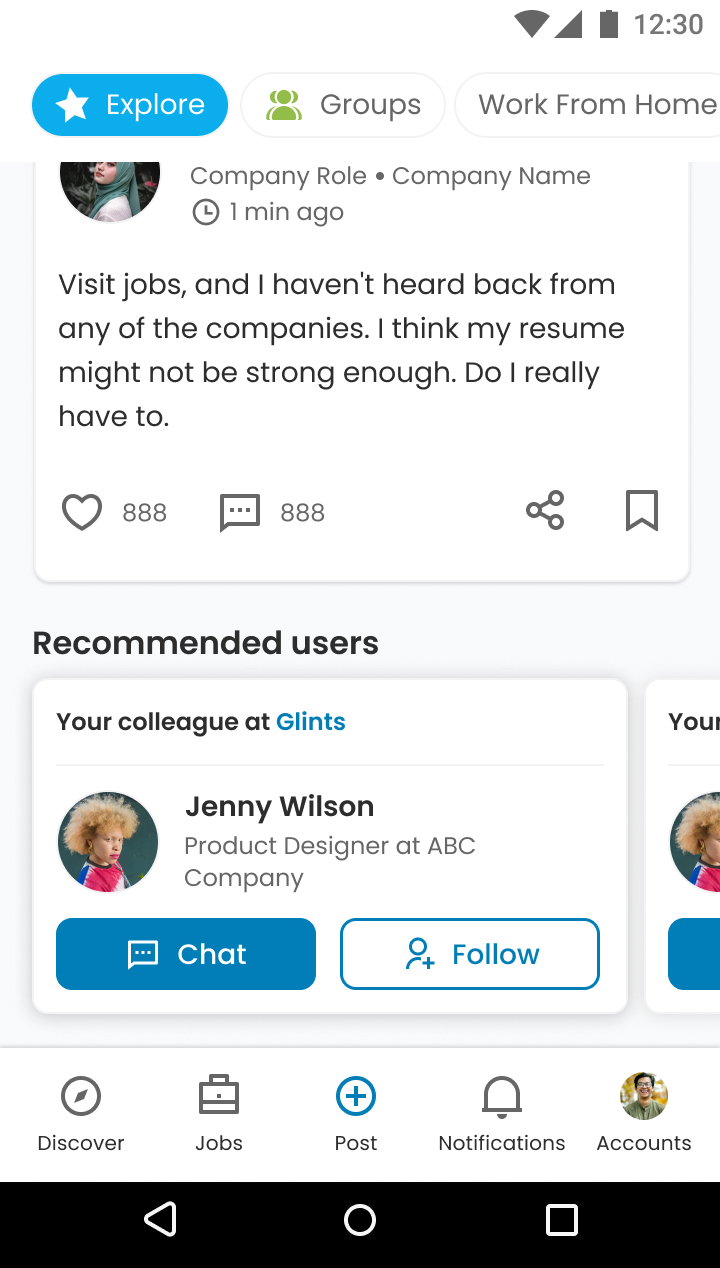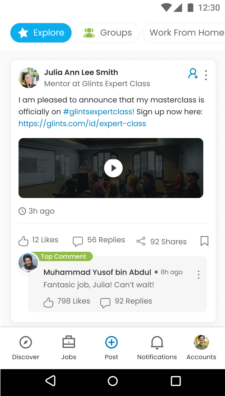Groups were categorized to help users join the ones that best suited their interests. Similar to the feed, our algorithm sorted and recommended groups to users, encouraging participation and discussions.